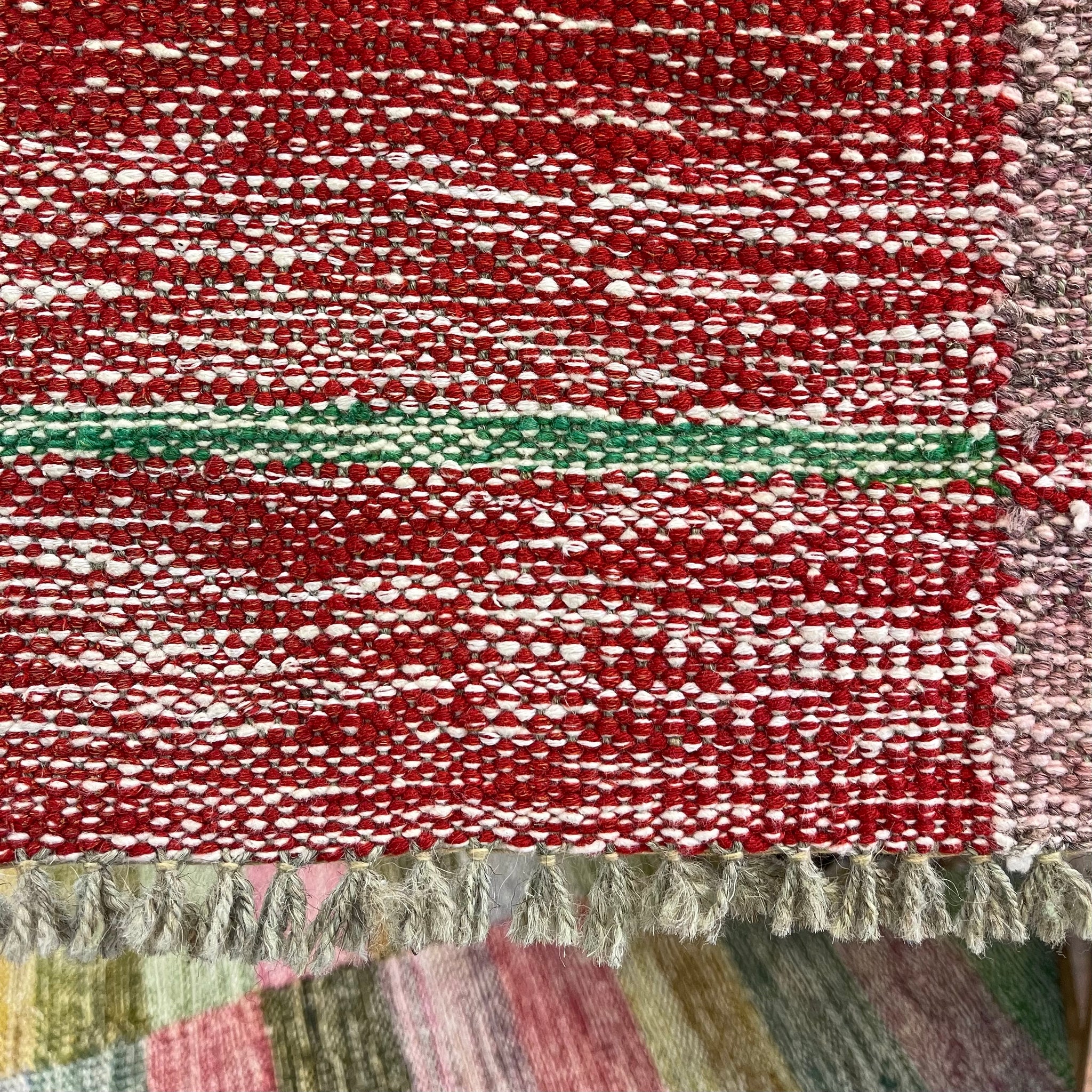 Square Stripe Multi Kilim. This one-of-a-kind kilim brings warmth and character to any room. Featuring an offset multi-color square design, it adds a layer of rich, textural depth to your space. Measuring 3'9 x 5'9, this versatile piece works beautifully in living rooms, bedrooms, or entryways. Each kilim is unique, making it a distinctive addition to your home décor that tells its own story.