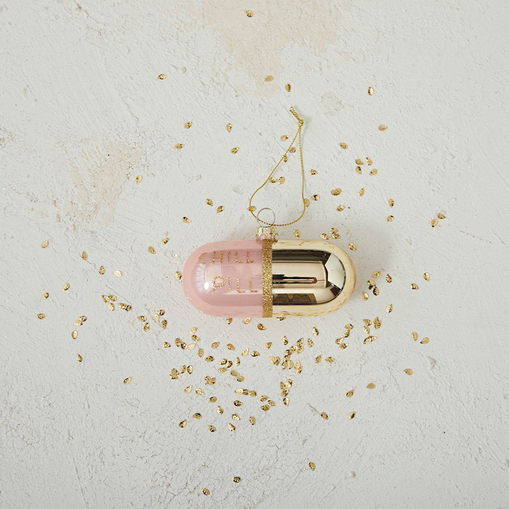 Crafted from glass and shaped like a pink and gold pill, this whimsical holiday ornament is a cute and cheeky addition to your holiday décor.