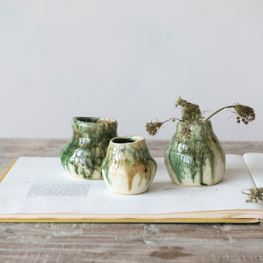 Approximately 3.25"H terra-cotta organic shaped vases with green reactive glaze.